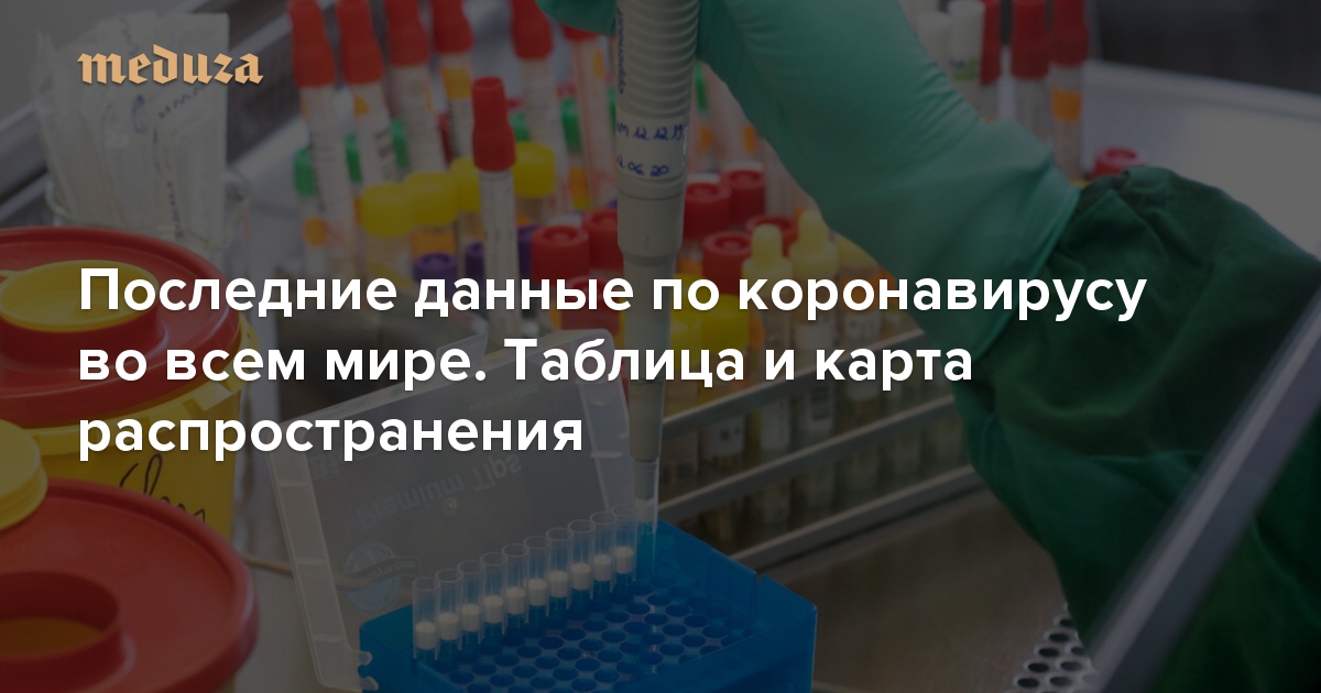 Что это за сообщение и почему оно повсюду на «Медузе»?Новая коронавирусная инфекция продолжает распространяться по миру. В этой таблице — последние данные о всех случаях заболевания, числе жертв и выздоровевших. Данные по всем странам, кроме России, собраны Университетом Джонса Хопкинса. Данные по России о заболевших и выписанных из больниц мы берем у оперативного штаба по борьбе с вирусом. Еще у нас есть карта и таблица по России, и карта распространения в мире.